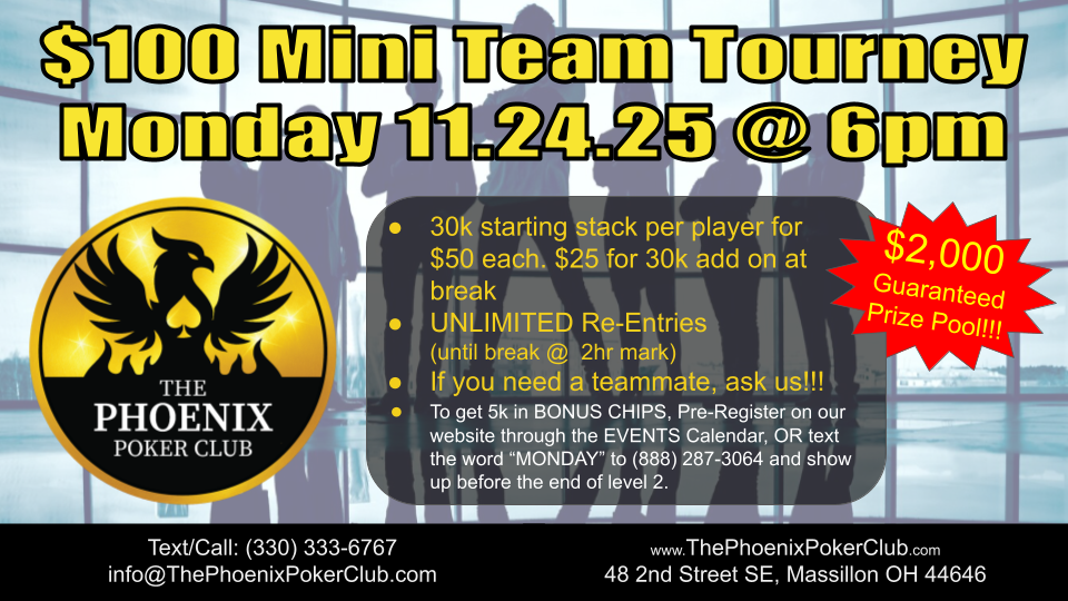 - Players who pre-register on our website via RSVP for a specific event on our website at www.ThePhoenixPokerClub.com will receive a bonus of $5k chips for their starting stack.