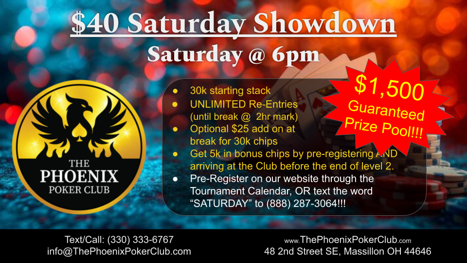 - Players who pre-register on our website via RSVP for a specific event on our website at www.ThePhoenixPokerClub.com, or text us to let us know they will be playing, AND arrive at the club prior to the end of level 2 will receive a bonus of $5k chips for their starting stack.