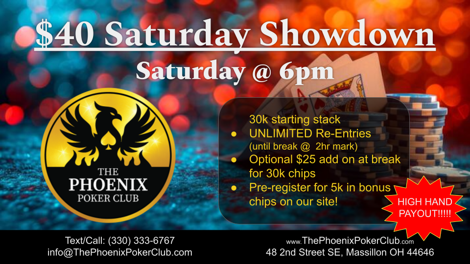 - Players who pre-register on our website via RSVP for a specific event on our website at www.ThePhoenixPokerClub.com will receive a bonus of $5k chips for their starting stack.
