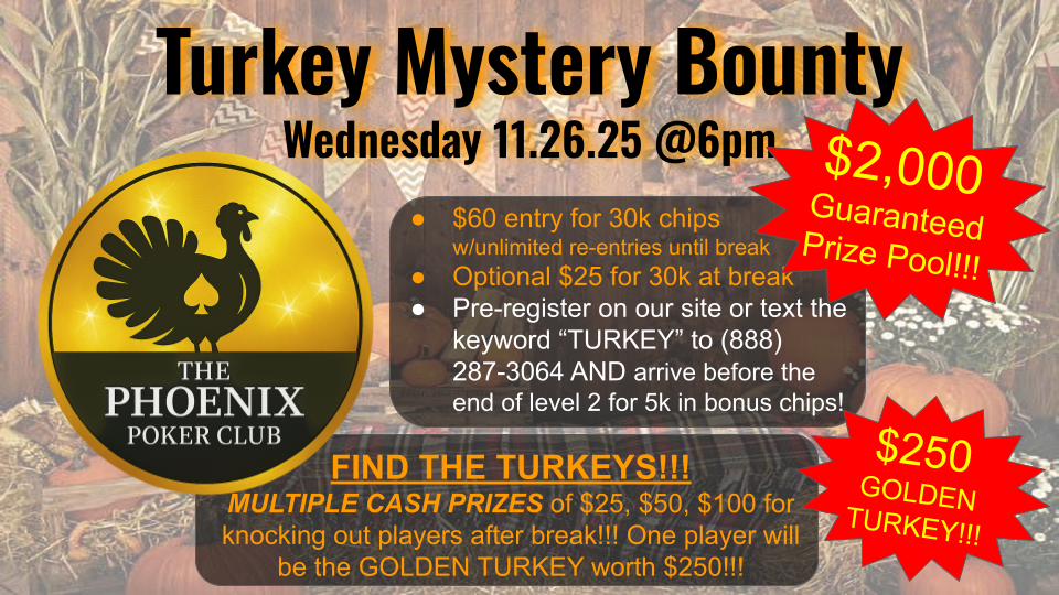 - Players who pre-register on our website via RSVP for a specific event on our website at www.ThePhoenixPokerClub.com will receive a bonus of $5k chips for their starting stack.