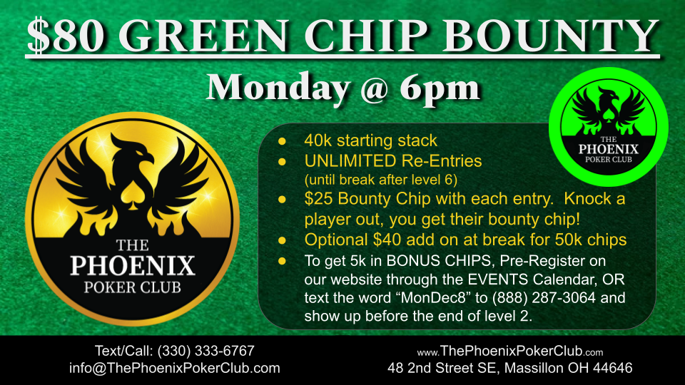 - Players who pre-register on our website via RSVP for a specific event on our website at www.ThePhoenixPokerClub.com will receive a bonus of $5k chips for their starting stack.