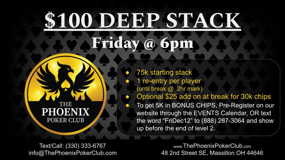 - Players who pre-register on our website via RSVP for a specific event on our website at www.ThePhoenixPokerClub.com will receive a bonus of $5k chips for their starting stack.