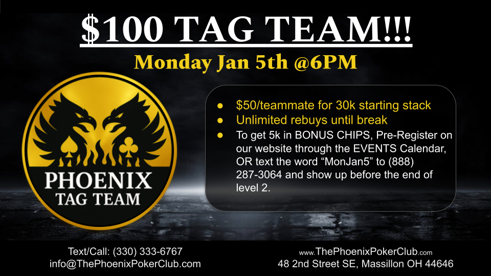 - Players who pre-register on our website via RSVP or text the keyword to (888) 287-3064 for a specific event on our website at www.ThePhoenixPokerClub.com will receive a bonus of $5k chips for their starting stack.
