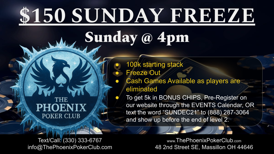 - Players who pre-register on our website via RSVP for a specific event on our website at www.ThePhoenixPokerClub.com will receive a bonus of $5k chips for their starting stack.