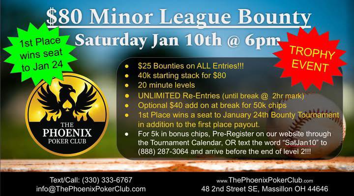 - Players who pre-register on our website via RSVP for a specific event on our website at www.ThePhoenixPokerClub.com or text the keyword will receive a bonus of $5k chips for their starting stack.