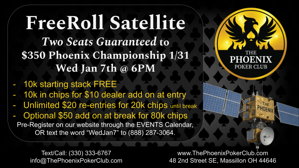 - Players who pre-register on our website or text keyword “WedJan7” to (888)287-3064 to RSVP for a specific event on our website at www.ThePhoenixPokerClub.com will receive a bonus of $2k chips for their starting stack.